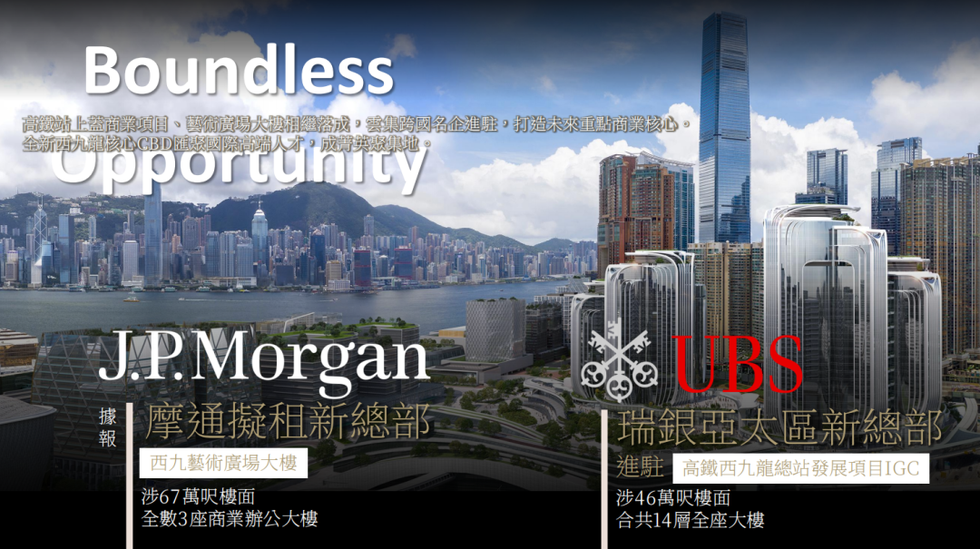 更关键的是,高铁站上盖商业项目将在今年年底落成,除了摩根大通,还有UBS、Santander Bank,都将进驻西九甲级商厦。