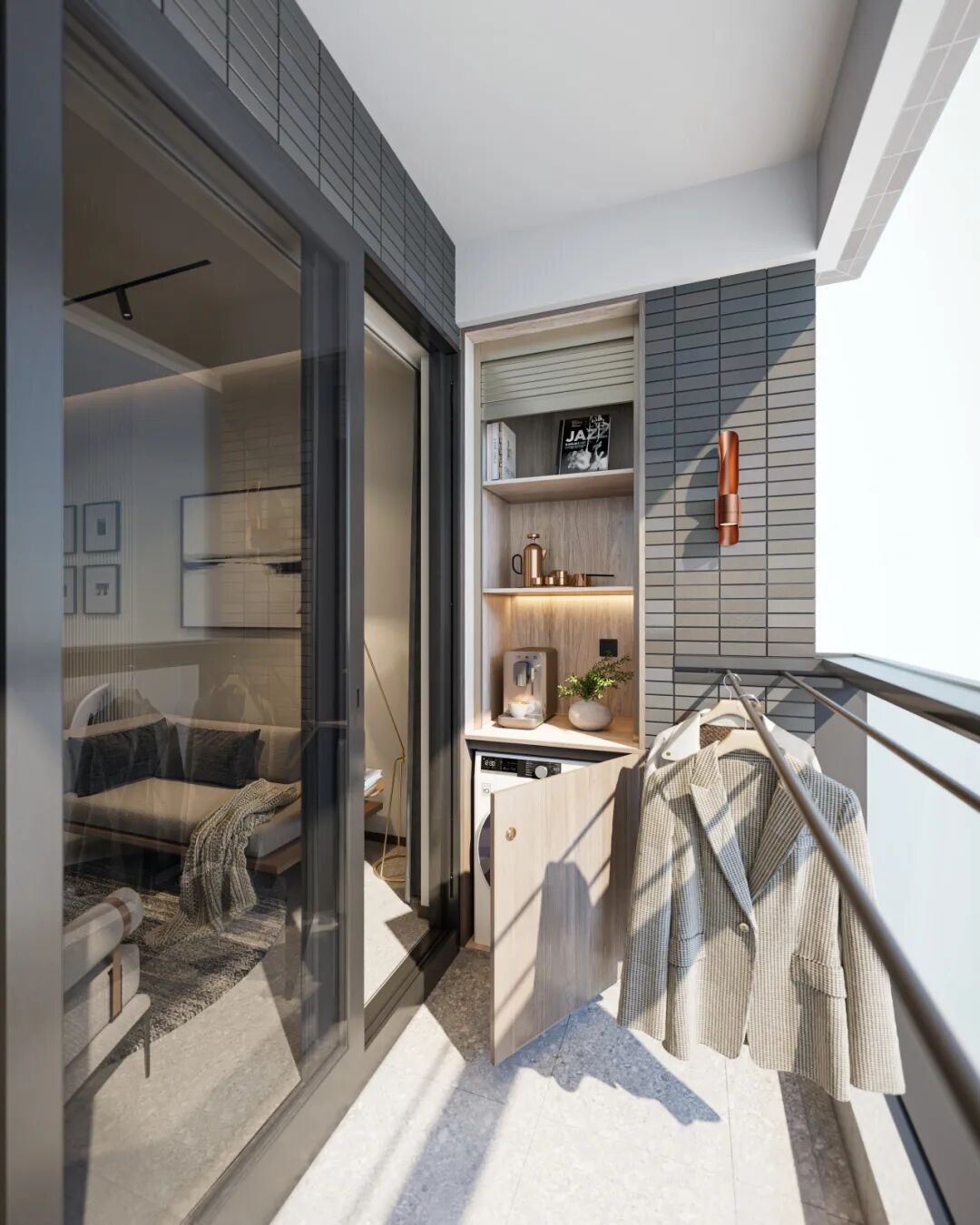 露台的多功能BALCONY+堪称经典,配备洗衣干衣机,并预留空间放置小型家电和生活用品,同时设有防雨趟闸。