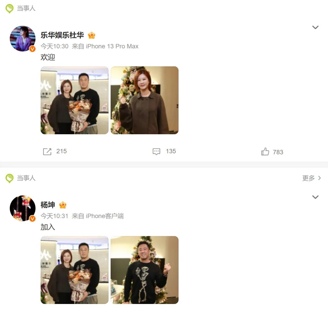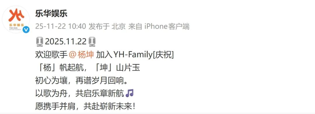 11月22日,知名歌手杨坤宣布加入乐华。 乐华娱乐杜华晒出和杨坤的合照发文:欢迎。 对此,乐华娱乐官博发文确认:欢迎歌手杨坤加入YH-Family。「杨」帆起航,「坤」山片玉。初心为壤,再谱岁月回响。以歌为舟,共启乐章新航。愿携手并肩,共赴崭新未来。公开资料显示,北京乐华圆娱文化传播有限公司,简称乐华娱乐,成立于2009年6月,主要业务分为乐华音乐、乐华经纪、乐华影视和乐华综艺四大板块。公司旗下艺人有韩庚、王一博、李汶翰、孟美岐、吴宣仪、程潇等。 杨坤,1972年12月18日出生于中国内蒙古自治区包头市,毕业于内蒙古武警总队文工团,中国内地男歌手、音乐人、演员。 1994年,杨坤为电视剧《陌生的海岸》演唱主题曲《陌生海岸》,正式进入演艺圈。2002年,发行首张个人音乐专辑《无所谓》。2004年,首次参加中央电视台春节联欢晚会,并演唱歌曲《天下父母心》。2005年至2010年期间,他陆续推出《2008》《牧马人》《杨坤》《DISCO》等个人专辑。