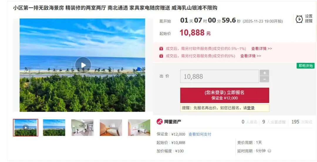11月22日,极目新闻记者在某网络拍卖平台搜索“乳山海景房”发现,目前有多套银滩海景房正在拍卖,面积大部分为50到100平方米,起拍价为1万元左右。记者随机挑选了一套与该网友类似的房型看到,这套待拍卖的二手房户型为二居室二厅一卫,面积为60.60平方米,竞买公告显示:起拍价为10888元;保证金为12000元;加价幅度为100元或整倍。目前这套房距拍卖开始还有1天7小时左右,已吸引了195次围观,有9人设置提醒,但暂无人报名。