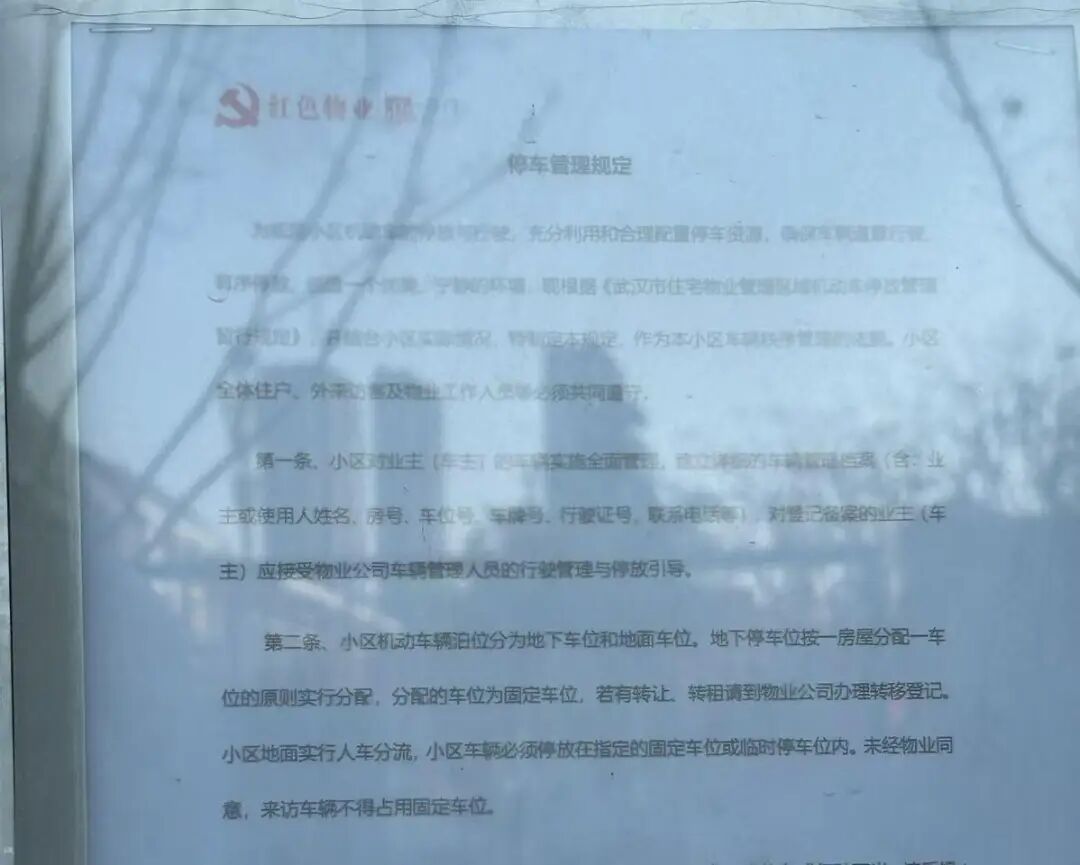 红星新闻记者在小区现场走访看到,小区事务公示栏张贴的“停车管理规定”第二条称,“小区机动车辆泊位分为地下车位和地面车位。小区地面实行人车分流,小区车辆必须停放在指定的固定车位或临时停车位内。未经物业同意,来访车辆不得占用固定车位。”