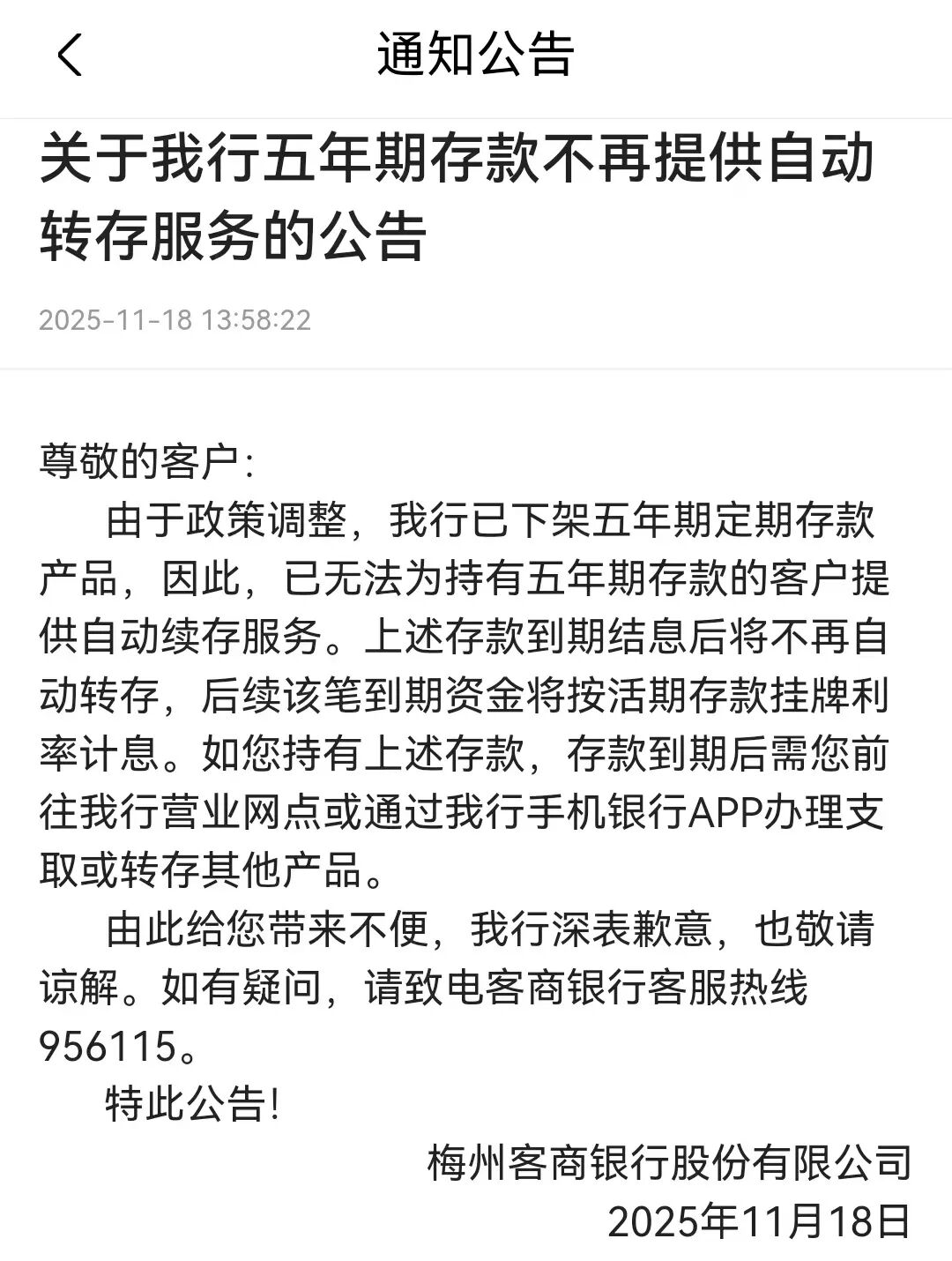 11月18日,梅州客商银行在公告该行五年期存款不再提供自动转存服务时称,由于政策调整,该行已下架五年期定期存款产品。因此,已无法为持有五年期存款的客户提供自动续存服务。上述存款到期结息后将不再自动转存,后续该笔到期资金将按活期存款挂牌利率计息。