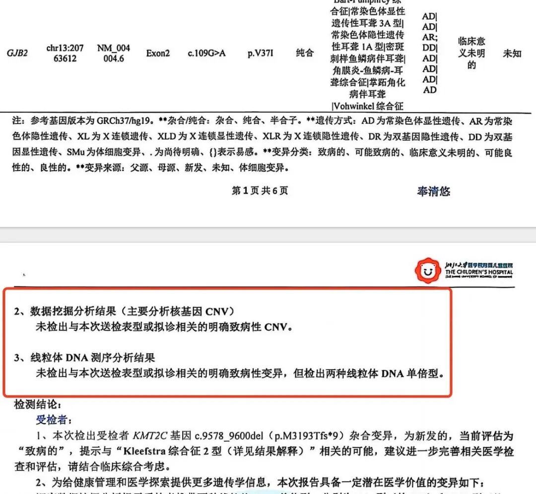 此外,10月9日所做的心脏彩超显示,小泡芙心脏正常,但“三尖瓣轻度反流”;10月13日,奉先生为小泡芙做了基因检测,11月3日的报告结果显示“未检测出明确致病性CNV或变异”。