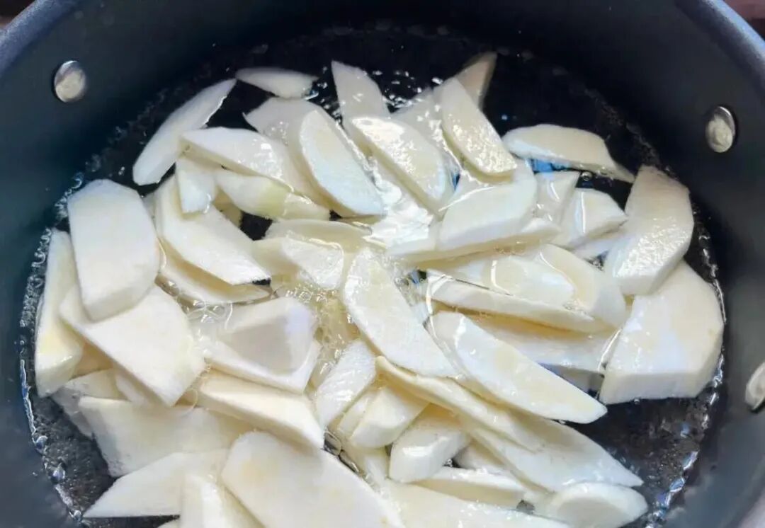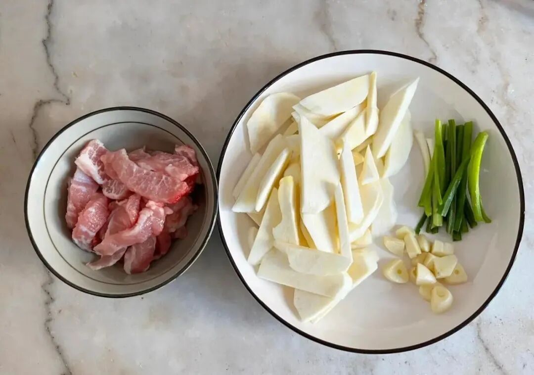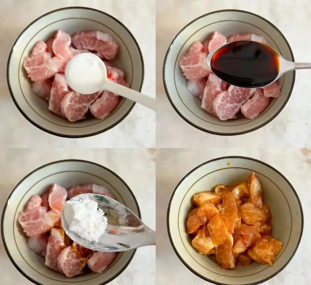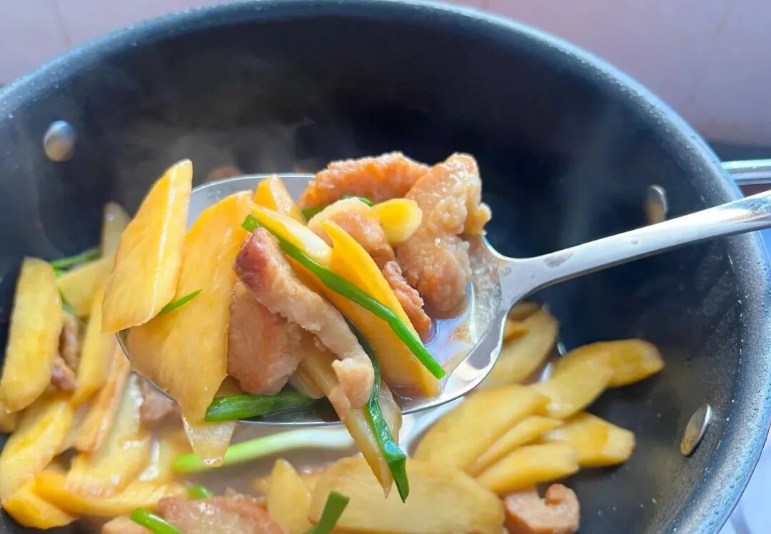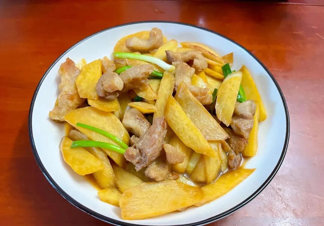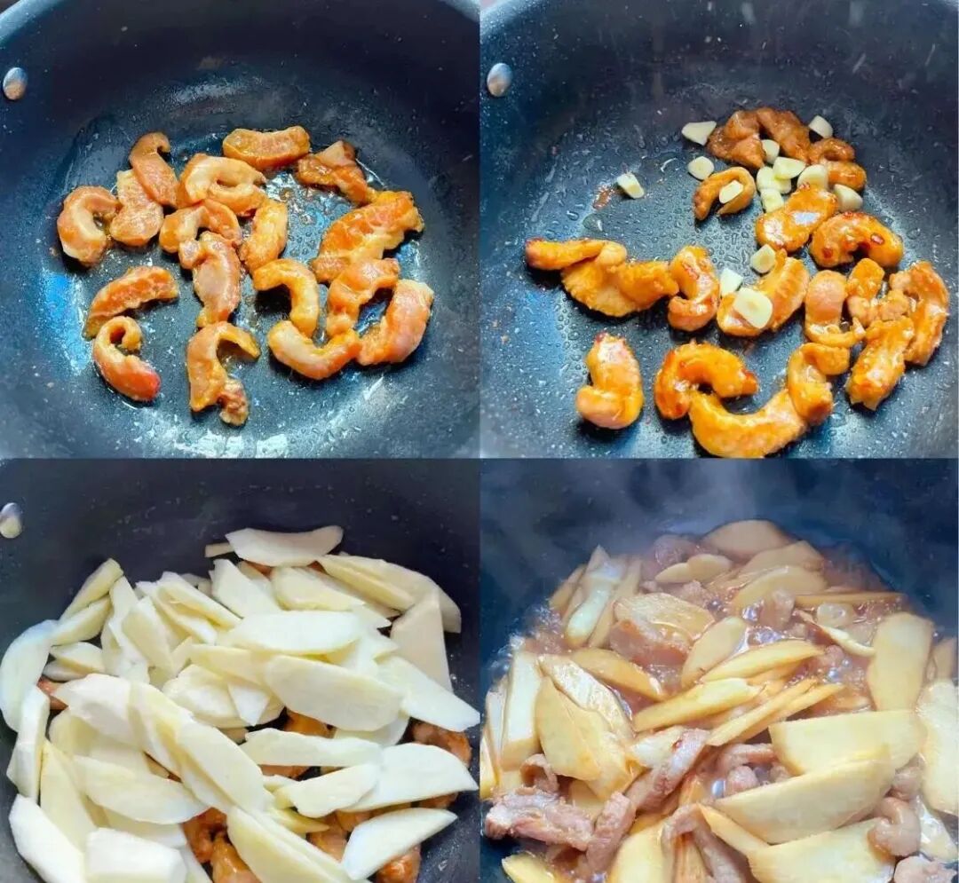 茭白被誉为“水中参” 入口甘甜、口感脆爽很是美味 今天分享一道茭白炒肉 鲜香脆嫩、好吃又下饭 家人都爱吃 食材:茭白、梅花肉、蒜、葱 调料:花生油、盐、生抽、蚝油、淀粉、白砂糖 茭白去外壳斜刀切片 水开后放入茭白焯水后沥干水分备用 ps:茭白草酸含量高,炒之前记得要焯水哦 梅花肉切片加1小勺盐、1勺生抽 少许淀粉、油抓拌均匀腌制20分钟 热锅热油放入腌制好的肉片翻炒至变色断生 放入蒜末炒出香味 倒入茭白一起翻炒均匀 倒入调好的酱汁(1勺生抽、1勺蚝油、少许糖、盐、淀粉搅拌均匀,再加小半碗清水) 大火煮沸盖上盖子焖煮4分钟 最后放入葱段炒匀就可以出锅啦 鲜香美味的茭白炒肉就做好啦 茭白鲜嫩脆爽 肉片嫩滑入味 好吃下饭的家常菜 来源:千厨百味、如有侵权请联系删除