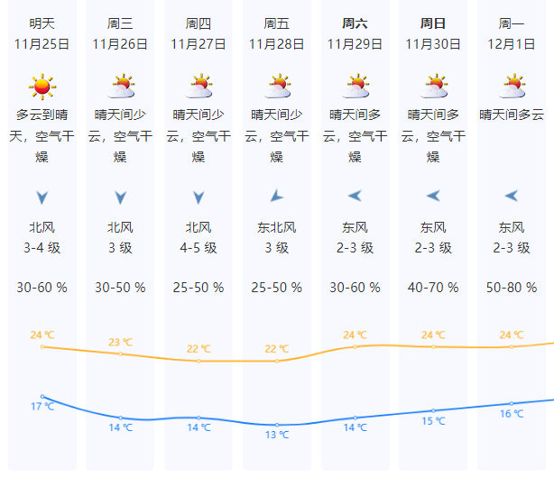25日(周二),南部沿海市县多云转晴,其余市县晴到少云。最低气温:粤北偏北市县9~12℃,南部沿海市区16~19℃,其余市县12~15℃。