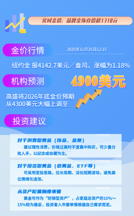 今日实时金价显示:品牌金饰克价大部分超1310元,较日前上涨超1.31%。
