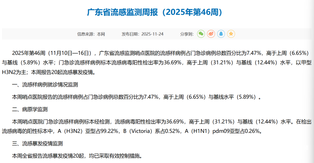 广东省疾控中心发布的《广东省流感监测周报(2025年第46周)》显示,2025年第46周(11月10日—16日),广东省流感监测哨点医院的流感样病例占门急诊病例总数百分比为7.47%,高于上周(6.65%)与基线(5.89%)水平;门急诊流感样病例标本流感病毒阳性检出率为36.69%,高于上周(31.21%)与基线(12.44%)水平,以甲型H3N2为主;本周报告20起流感暴发疫情。