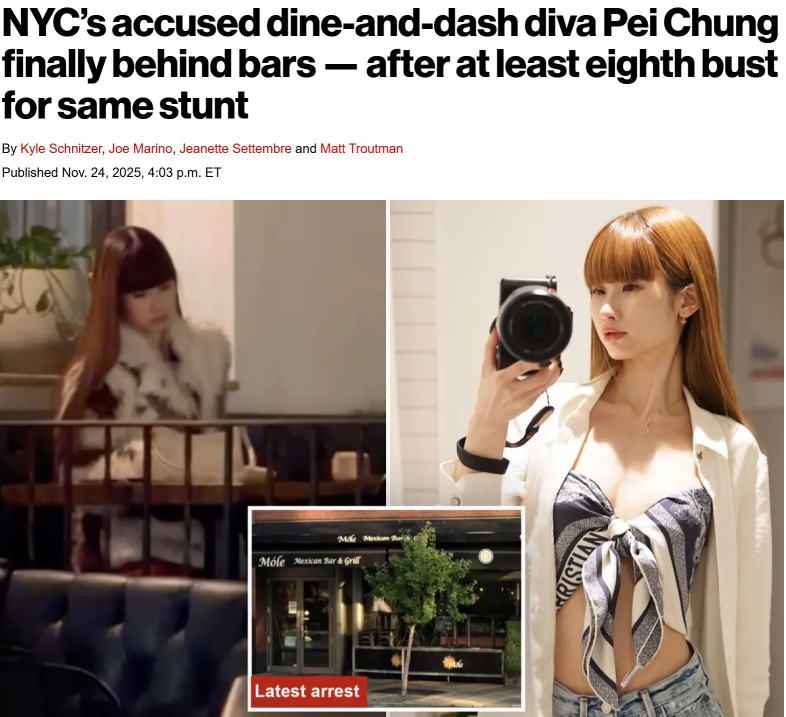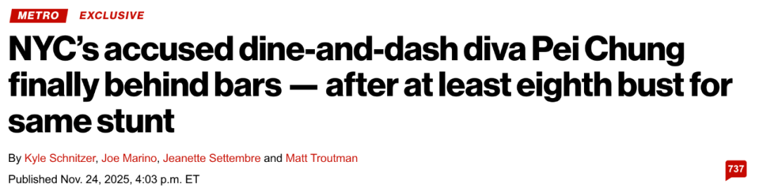 最近,34岁的华人女子Pei Chung被曝出疑似“假名媛”身份,她不仅在纽约的高端餐厅吃霸王餐,还因为拖欠前纽约州州长房租即将被赶出公寓。她又一次被警方逮捕!