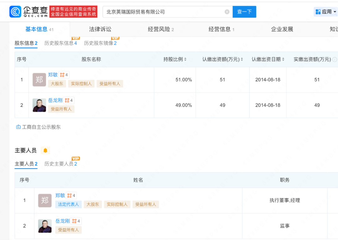企查查工商信息显示:北京英瑞国际贸易有限公司成立于2014年8月。法定代表人为郑敏,注册资本100万人民币,经营范围包括企业策划、设计等股东信息显示,该公司由岳龙刚(岳云鹏)及妻子郑敏共同持股。