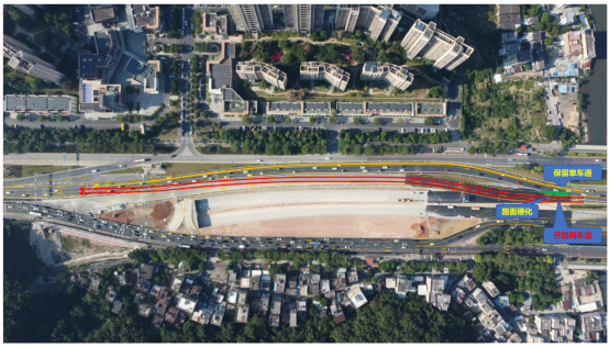 2、其中2条车道(红色标线)调整至南侧硬化区域通行