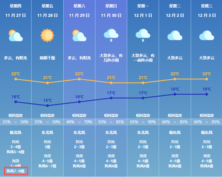 预计27-28日受弱冷空气影响,我市晴朗干燥天气持续,早晚清凉;29日至12月3日云量较多,间中有几阵小雨。温馨提示:近期天气相当干燥,请继续做好森林防火及居家用火用电安全工作;今天沿岸及海面风力较大,请注意海上交通安全。