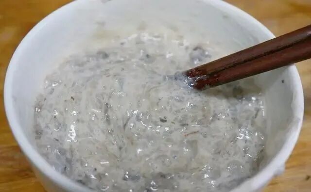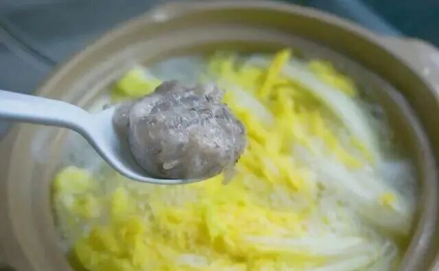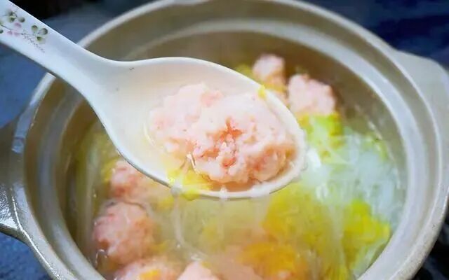 今天做了一道比较清淡的汤,少油少盐,一滴油都没放,口感滑嫩爽口,清淡好喝,营养倍儿丰富。 所需食材: 鲜虾10只,娃娃菜半棵,粉丝适量,盐3克,料酒1勺,蛋清1只,玉米淀粉2勺,盐1克,白胡椒粉少许 做法: 1.鲜虾去头和尾,去除虾线,剥去虾皮留下虾仁备用。 2.将虾肉剁成虾泥,如图。 3.将剁好的虾泥放到容器中,放入1勺料酒,1只蛋清,2勺玉米淀粉,1克盐,少许白胡椒粉。朝一个方向搅拌直到起劲。放冰箱冷藏20分钟左右。冷藏可以让虾滑变得稍硬些,更容易成型。 4.娃娃菜洗净,切开备用。 5.锅中放水,放入粉丝烧开。 6.加入娃娃菜,继续煮至娃娃菜变软。 7.用勺子将虾滑一勺一勺地放入锅中煮,加入2克盐和少许白胡椒粉调味,全部煮熟后就可以关火了。虾肉很容易熟,基本上变了颜色漂起来就熟了。