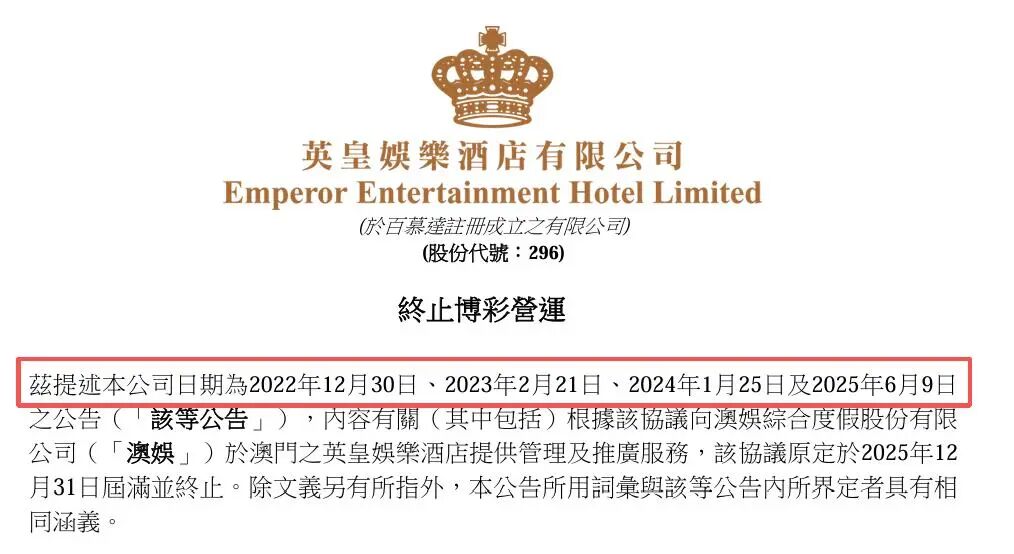 在澳娱正式通知终止博彩区服务协议之前,英皇娱乐酒店自2022年至2025年间已多次发布公告,持续披露委托经营协议的进展与到期安排。