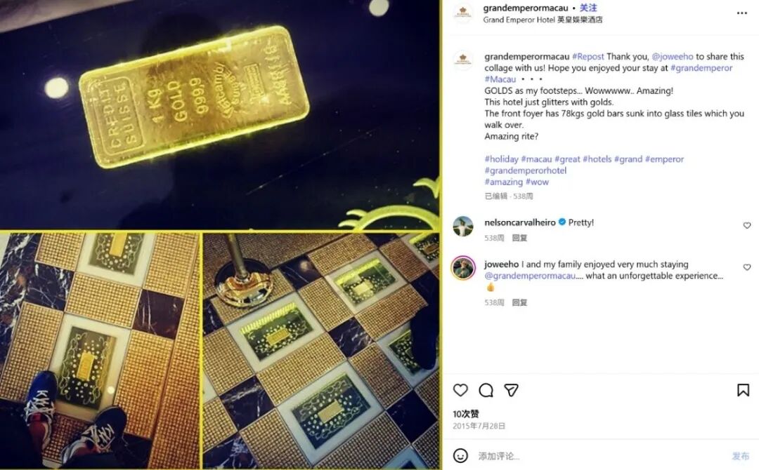 酒店大堂内,78块足一公斤的黄金铺就而成的大道在镁光灯下流光溢彩,熠熠生辉。