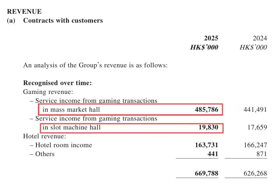 根据英皇娱乐酒店2025财年报告,其博彩收入中,大众赌桌贡献约4.86亿港元,占总博彩收入的九成以上;而角子机收入仅约1980万港元,占比不足4%。