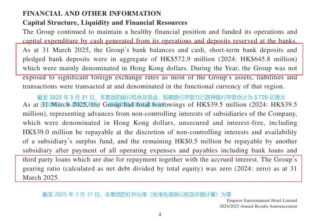 从经营主体本身来看,截至2025年3月31日,英皇娱乐酒店账上持有约5.729亿港元现金及短期、质押存款,净负债接近于零,短期内具备一定缓冲能力。