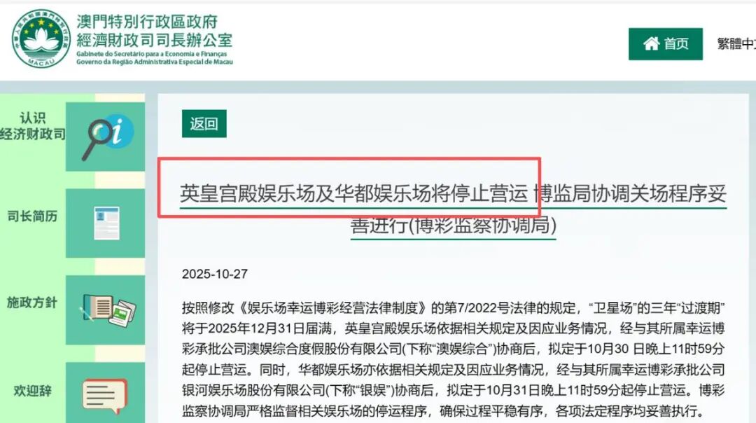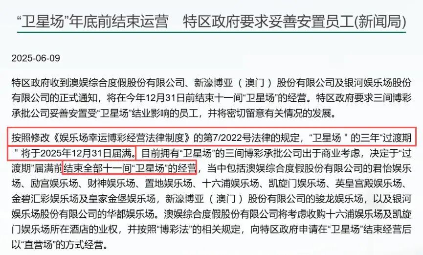 监管部门的公开信息也显示,包括英皇宫殿在内的十一间卫星娱乐场,都将在过渡期内陆续结束博彩运营。