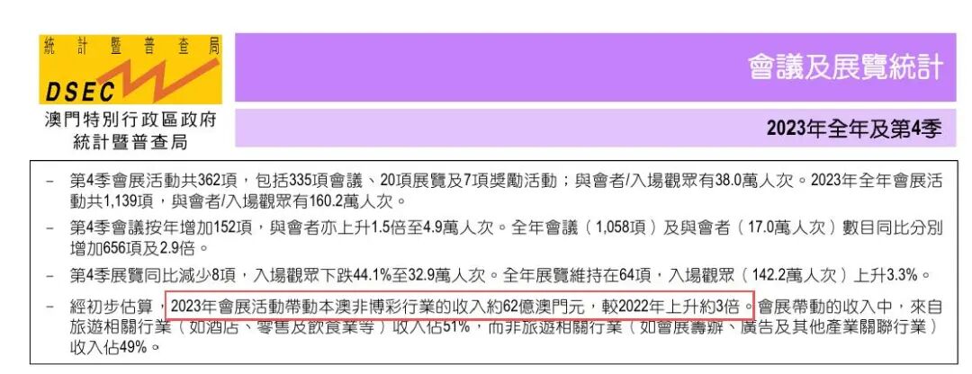 2023 年,全澳门会展活动突破1100场,带动非博彩收入约62亿澳元。