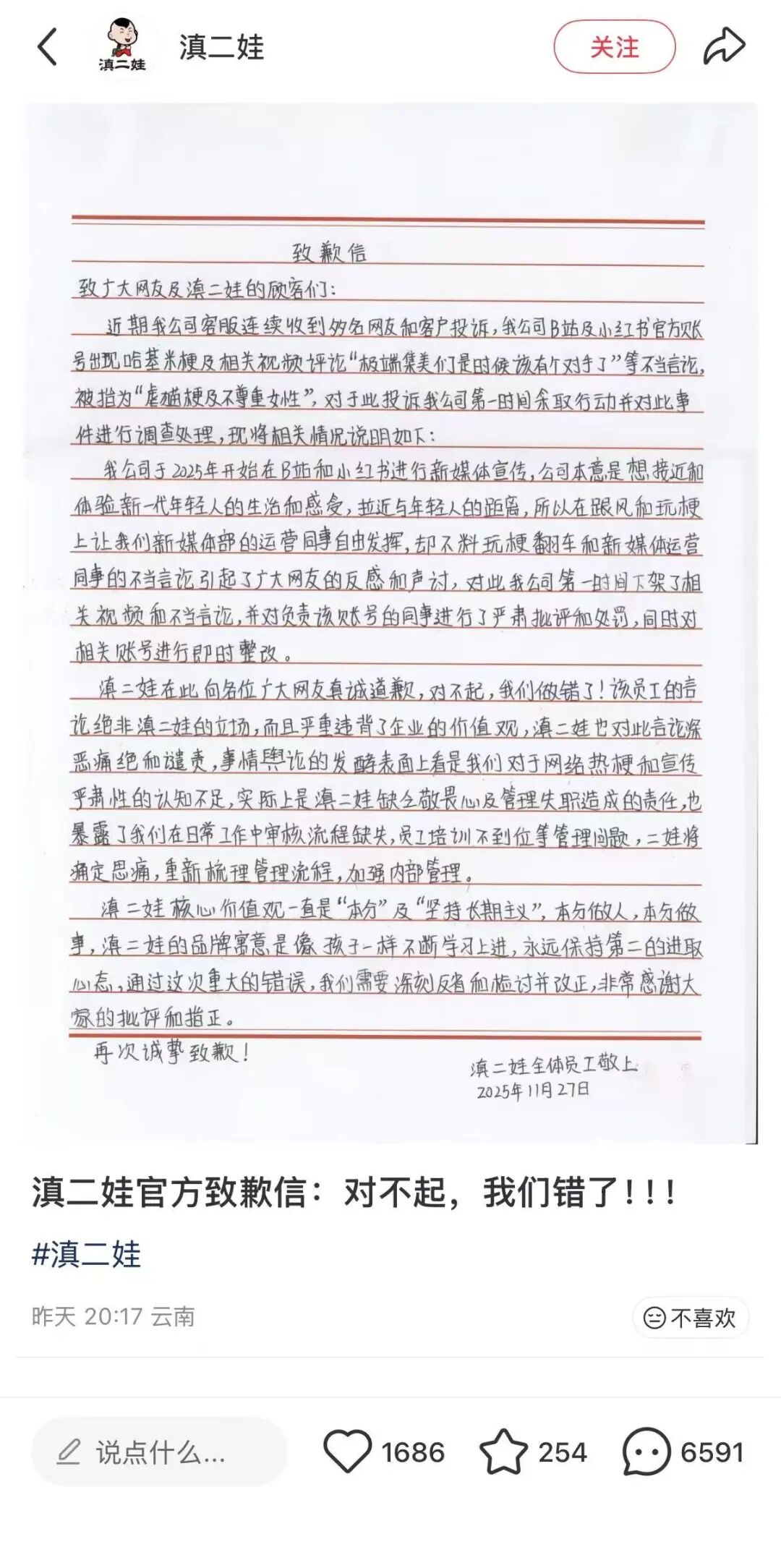 致歉信中提到,公司于2025年开始在B站和小红书进行新媒体宣传,本意是想接近和体验新一代年轻人的生活和感受,拉近与年轻人的距离,所以在跟风和玩梗上让新媒体部的运营同事自由发挥,不料玩梗翻车和新媒体运营同事的不当言论引起网友反感和声讨。对此,该公司第一时间下架了相关视频和不当言论,并对负责该账号的同事进行了严肃批评和处罚,同时对账号即时整改。 “滇二娃”还表示,该员工的言论绝非滇二娃的立场,而且严重违背了企业的价值观,滇二娃也对此言论深恶痛绝和谴责,事情舆论的发酵表面上看是公司对于网络热梗和宣传平肃性的认知不足,实际上是滇二娃缺乏敬畏心及管理失职造成的责任,也暴露了公司在日常工作中审核流程缺失,员工培训不到位等管理回题,公司将痛定思痛,重新梳理管理流程,加强内部管理。 据现代快报,近日,“滇二娃”被指在社交平台频繁发布包含虐猫梗、不尊重女性的言论,包括“即将推出哈基米辣美卤多”“已经把老板抓去厂里生产‘哈基米’了”“极端集美们啥时候该有个对手了”等,被网友质疑是在利用低俗梗走另类出圈路线。