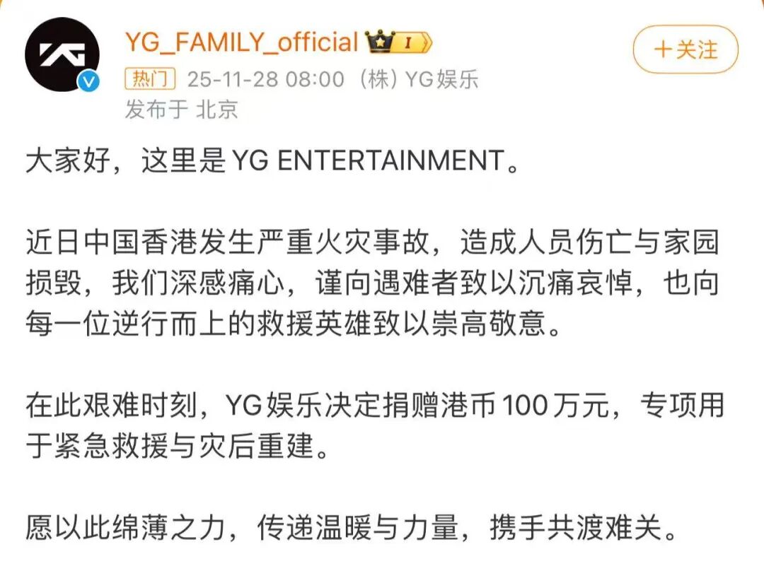 此外,YG 娱乐、SM 娱乐宣布向中国香港红十字会捐赠 100 万港元,为灾区救援贡献一份力量。