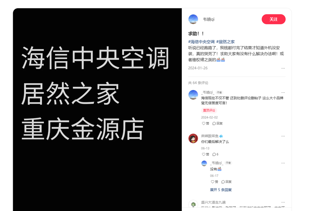 换言之,李先生的遭遇并非偶发事件,而是海信中央空调在部分地区销售与安装体系中长期存在的混乱和风险。