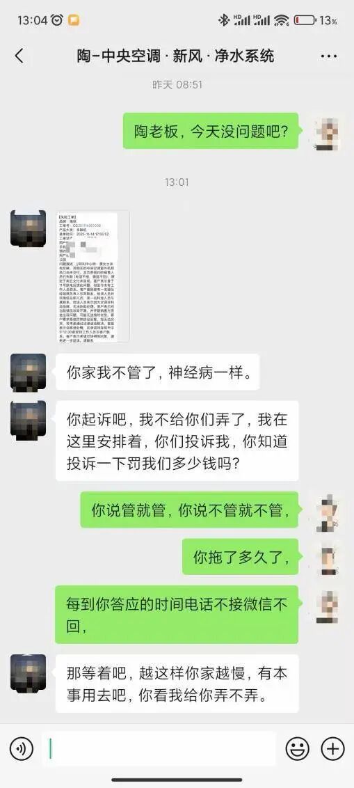 11月15日,在王女士向海信总部投诉后,已拉黑王女士的陶某突然向李先生微信回复,并明确告知李先生,由于其家人王女士的投诉导致他会被海信扣款,因此不会再为李先生提货安装。随后陶某拒接李先生及王女士的电话。