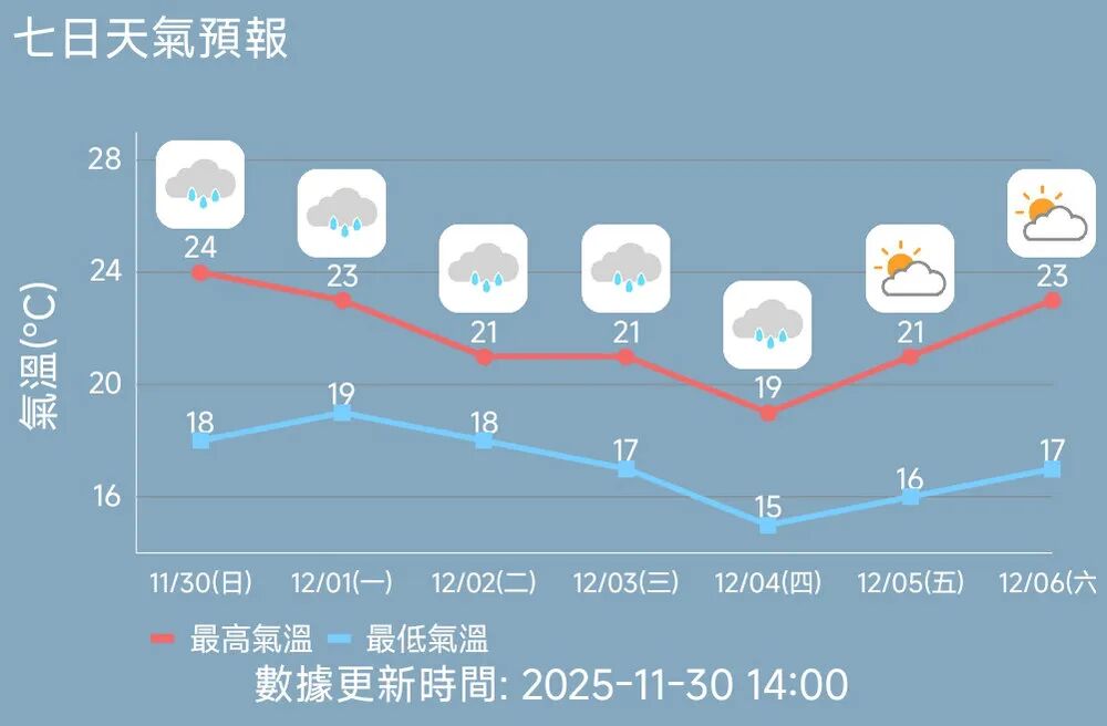 七日天气预报显示,明日(12月1日)大致多云,有几阵微雨,气温19至23度;后日(2日)大致多云,有几阵雨,气温18至21度;周三(3日)大致多云,有几阵微雨,气温17至21度。 周四(4日)气温略降,大致多云,初时有微雨,气温15至19度;周五(5日)多云,短暂时间有阳光,气温16至21度;周六(6日)多云,部分时间有阳光,气温17至23度。