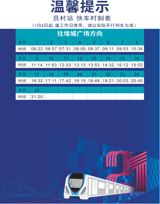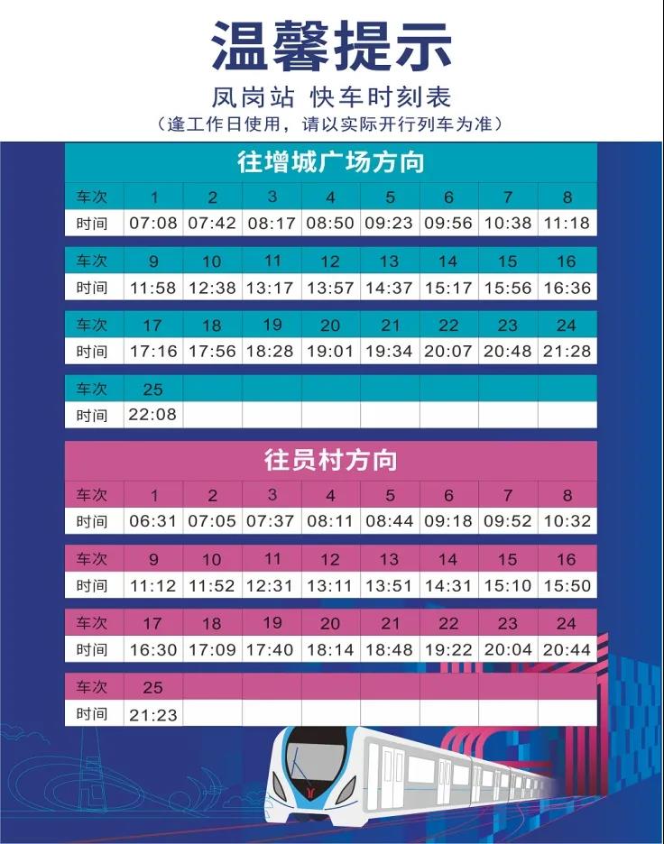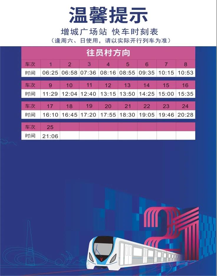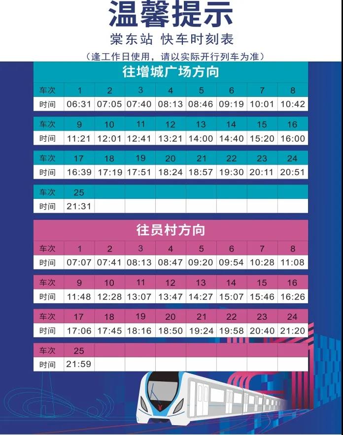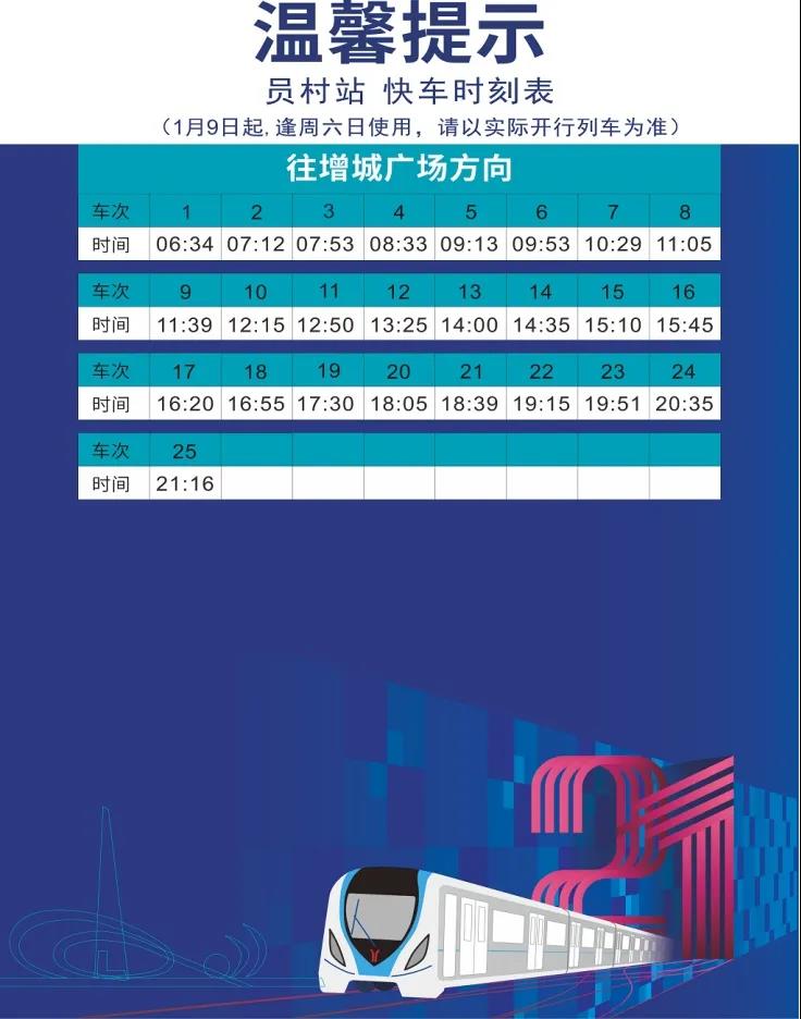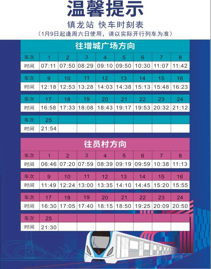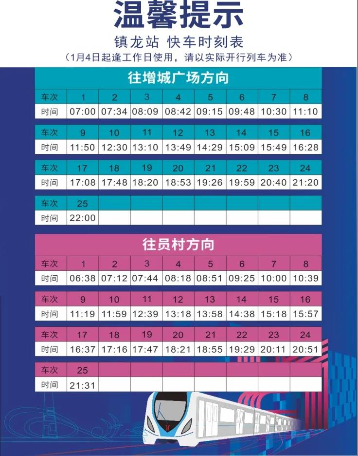 据广州地铁官方微信公众号消息,自1月4日起,广州地铁二十一号线快车时刻表将有所变动,最新的快车时刻表仍分为工作日和周六、日两个版本。 请注意,快车实际到站时间会根据列车运行情况和客流情况有所调整,此时刻表仅作为参考,搭乘时请以现场为准。候车时,大家记得要多留意站台广播、电视和投影的列车信息,区分好快车和普通列车,根据自己的行程选择班次,并预留足够的时间。 信息时报资料图 员村站 天河公园站 棠东站 黄村站 大观南路站 苏元站 镇龙站 凤岗站 增城广场站 员村站 天河公园站 棠东站 黄村站 大观南路站 苏元站 镇龙站 凤岗站 增城广场站 来源:广州地铁 |