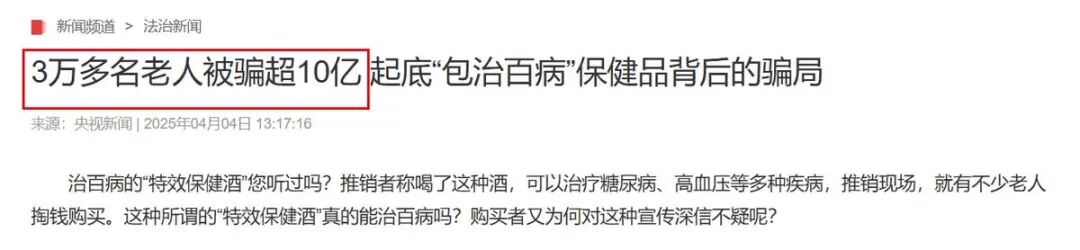 那另一种流传甚广的 “特效保健酒”,则凭着 “接地气” 的伪装,让更多警惕心较低的老人防不胜防,被骗老人超3万人,涉案金额超10亿元。