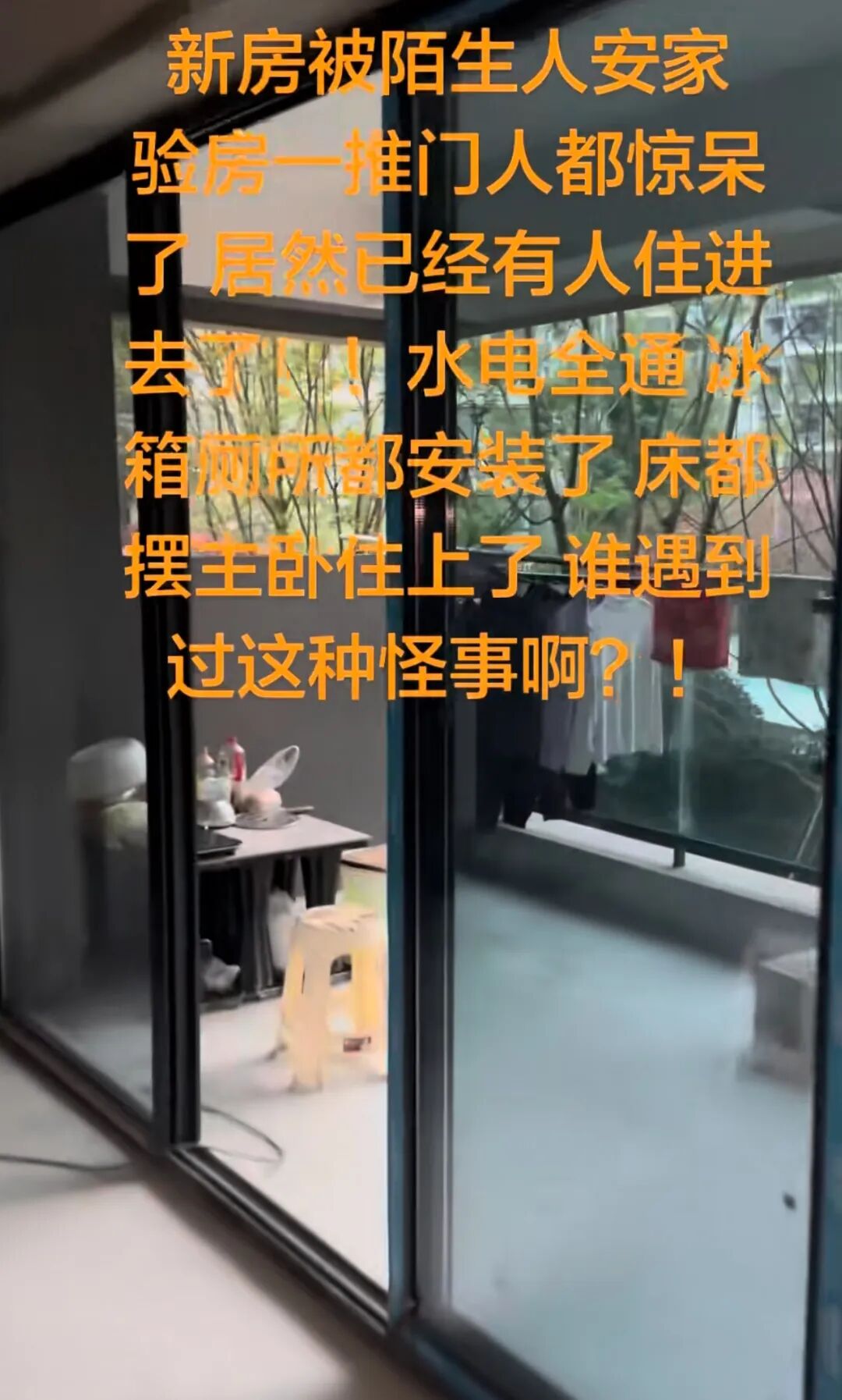 近日,有网友发视频称自己的新家被陌生人安家了。“验房一推门人都惊呆了,居然有人已经住进去了!水电全通,冰箱厕所都安装了,床都摆主卧住上了。”记者随后私信该网友,未获回复,同时了解到此事发生在四川绵阳。