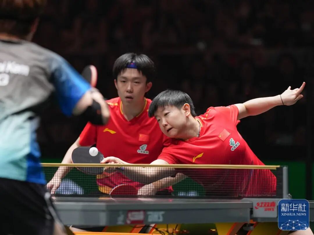 11月30日,中国队选手王楚钦/孙颖莎(右)在混双比赛中。最终,他们3比0战胜中国香港队选手黄镇廷/杜凯琹。