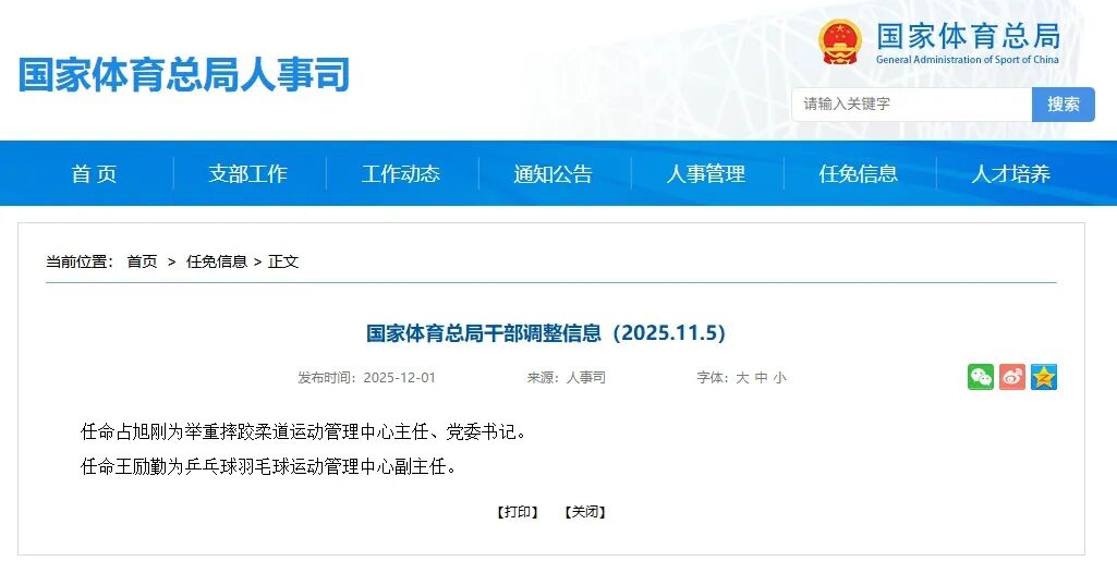 任命占旭刚为举重摔跤柔道运动管理中心主任、党委书记,任命王励勤为乒乓球羽毛球运动管理中心副主任。