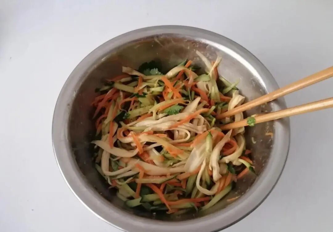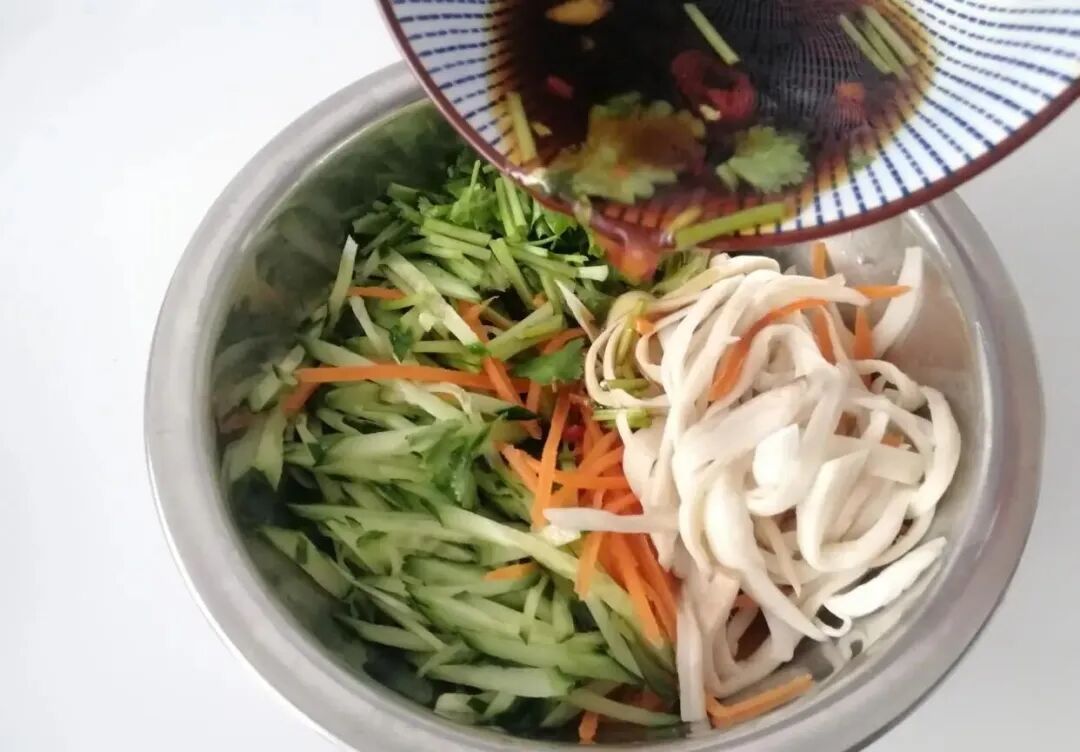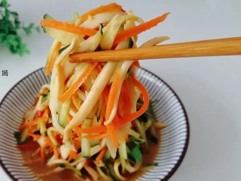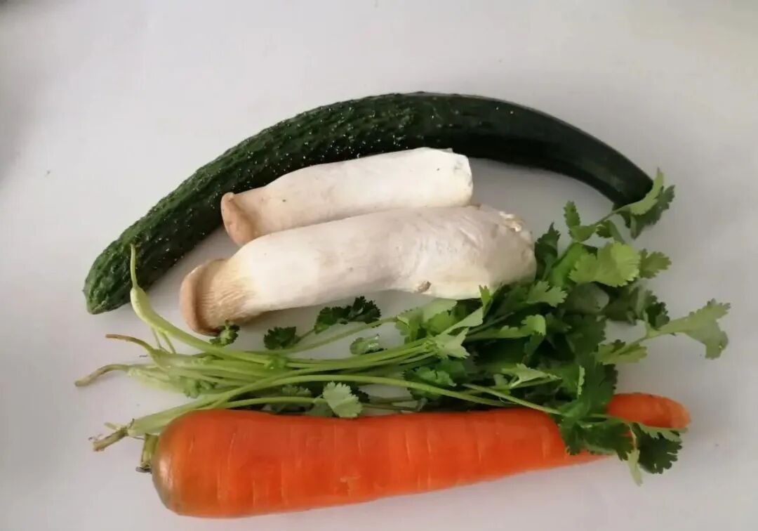今天分享的这道凉拌杏鲍菇黄瓜丝,清脆爽口又开胃,虽然是素菜但是比肉菜还好吃,上桌都抢着吃,满满一盘子一会功夫就吃光了。 【凉拌杏鲍菇黄瓜丝】 食材:杏鲍菇150克、黄瓜1根、胡萝卜1根、香菜2根、香醋、生抽、蚝油、盐、香油、白糖、花椒油、麻酱 做法及步骤: 第一步:杏鲍菇、黄瓜、胡萝卜、香菜都准备好,喜欢吃辣的可以再放上一个尖椒。 第二步:黄瓜和胡萝卜洗净切成细丝,香菜切段备用。 第三步:杏鲍菇洗干净用水煮一下,不需要切整个的来煮,时间可能长一些,其实这一步是要把杏鲍菇煮熟。 第四步:切好的胡萝卜也焯烫一下,两三秒就可以,赶快捞出,不然口感不脆了。 第五步:煮熟的杏鲍菇捞出,然后用手撕成一条一条的,煮熟的杏鲍菇特别好撕,如果生的撕的话容易断。 第六步:拿一个小碗,倒入2勺香醋、2勺生抽、1勺盐、1勺白糖、1勺蚝油、1勺香油、1勺花椒油搅匀调成料汁。 第七步:把黄瓜丝、胡萝卜丝、杏鲍菇丝、香菜段放进一个大点的盆中,倒入调好的料汁,再放入1勺芝麻酱调拌均匀入味。 这道小凉菜就拌好了,冬天,宁可不吃肉也要吃这菜,简单一拌,清脆爽口,怎么吃都不胖!别看冬天冷,其实室内还是挺热的,所以饮食上要荤素搭配,尤其是孩子不要吃太多肉,常吃点青菜不容易上火,平时还要注意多喝水。