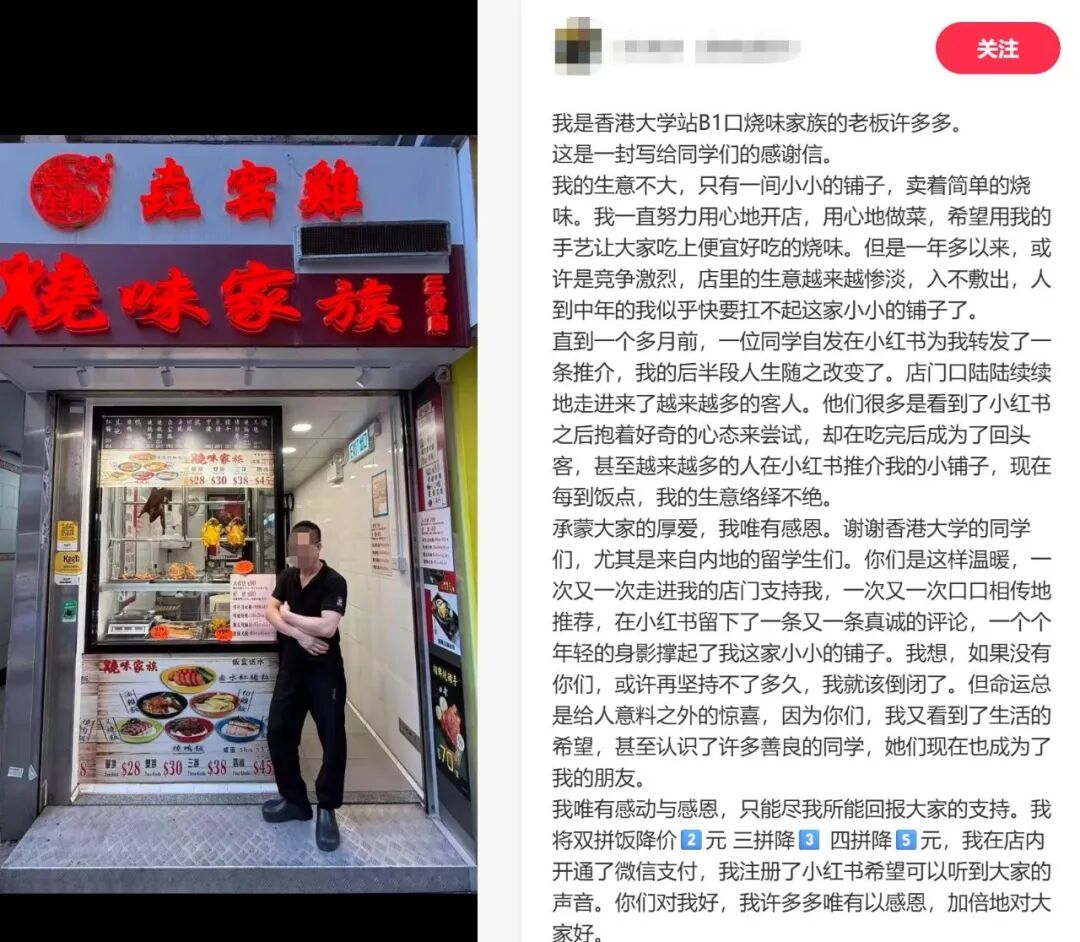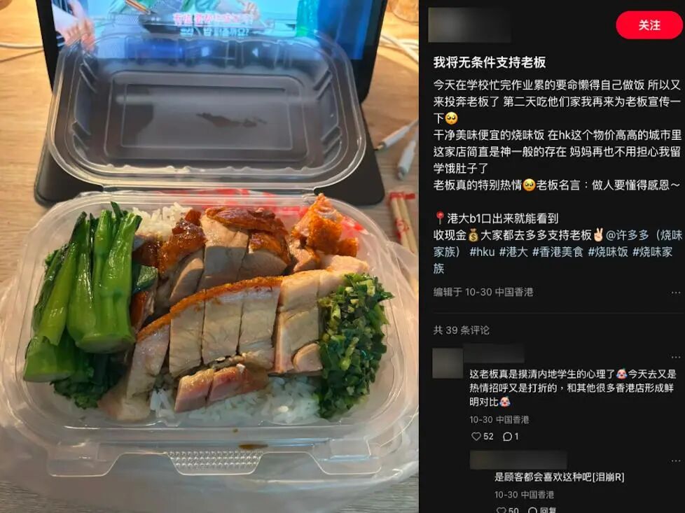转机来得猝不及防。一个多月以前,一个在港大读书的内地女学生随手发了条小红书:“发现港大附近最好吃的烧鸭饭!双拼才30港币,相当便宜。”