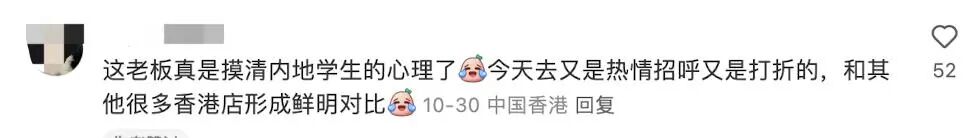 老板在感谢信里写道,“谢谢香港大学的同学们,尤其是来自内地的留学生们。你们是这样温暖......我想,如果没有你们,或许再坚持不了多久,我就该倒闭了。但命运总是给人意料之外的惊喜,因为你们,我又看到了生活的希望。”