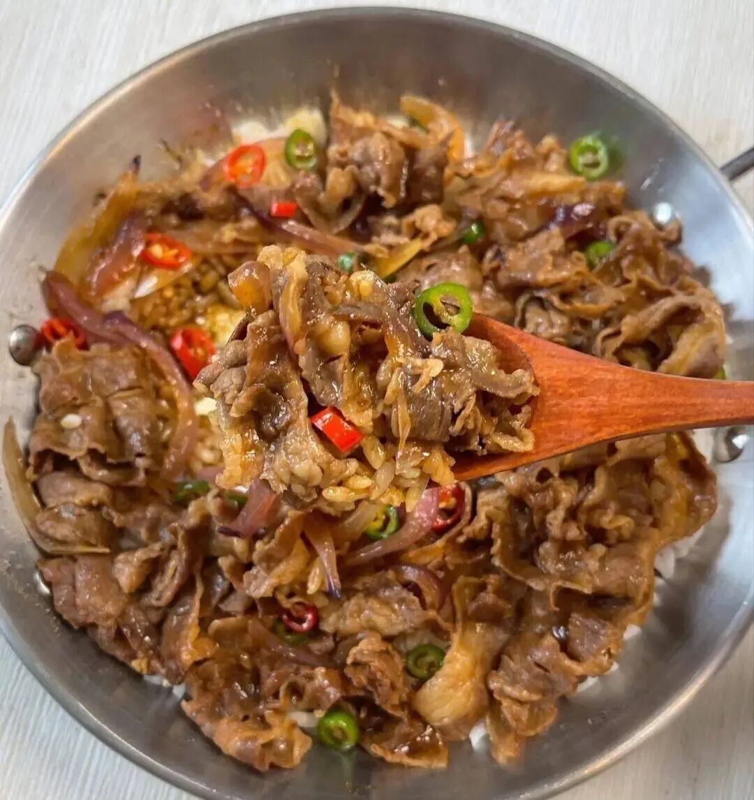 3. 加入肥牛,快炒1分钟,淋生抽和黑胡椒调味。