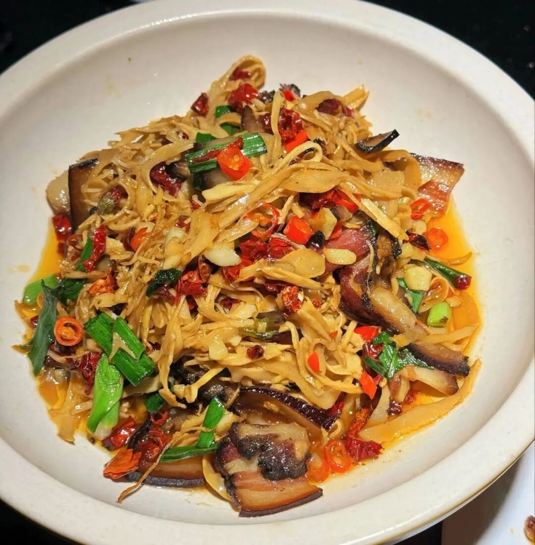 4. 炒香配料: 用锅里的腊肉油,放入姜片和青蒜的白色部分,爆香。然后倒入处理好的烟笋丝,大火翻炒2-3分钟,让烟笋充分吸收油脂的香味。