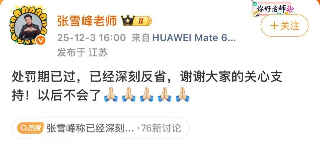 12月3日16时,张雪峰发布微博称,“处罚期已过,已经深刻反省,谢谢大家的关心支持!以后不会了。”