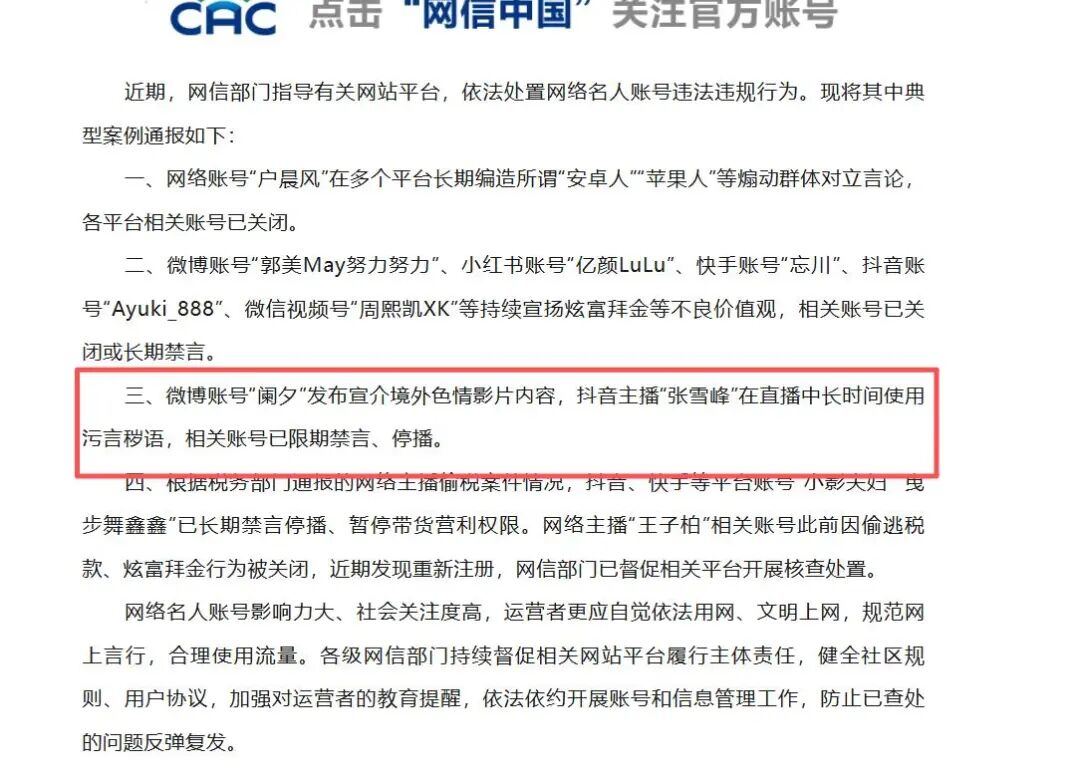 据网信中国12月3日消息:近期,网信部门指导有关网站平台,依法处置网络名人账号违法违规行为,并通报了一些典型案例。案例之一为“抖音主播‘张雪峰’在直播中长时间使用污言秽语,相关账号已限期禁言、停播。”