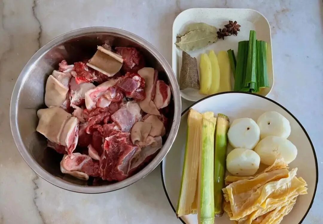 食材:羊腩、腐竹、甘蔗、马蹄、蒜苗、姜