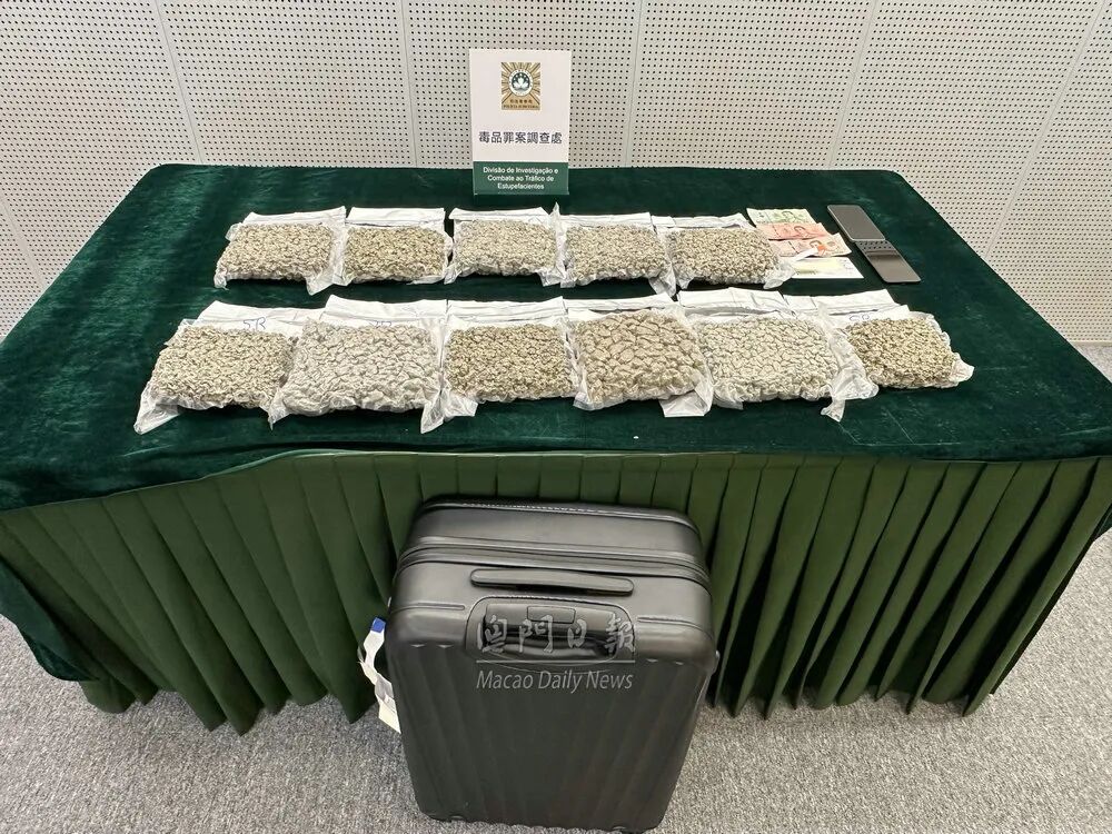 司警检获市值约627万澳门元大麻花 经搜查,在嫌犯的行李箱内检获12包以银色锡纸真空包装的大麻花毒品,连真空袋共重约6,279克。 司警经深入调查,发现嫌犯在马来西亚受贩毒集团招揽后,先赴泰国,提取藏有大麻花毒品的行李箱,再飞赴菲律宾,后辗转来澳,计划将大麻花毒品偷运到香港。贩毒集团“上线”承诺事成后向嫌犯支付1万元马来西亚令吉,折合约19,300澳门元作为运毒报酬。 排除七人车司机涉案