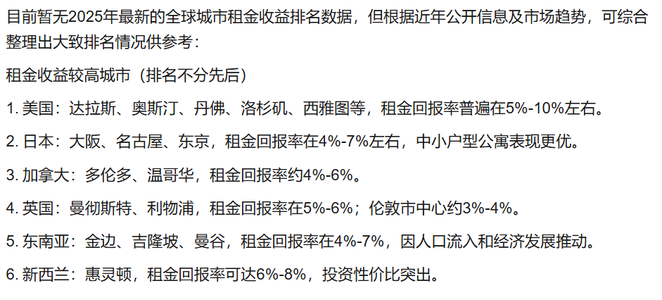 除金融产品外,具备高租金收益的境外房产也是不错的选择。部分地区房产净租金收益率可达 4%—5%,既能获得稳定的现金流收益,又能享受资产增值的潜力。