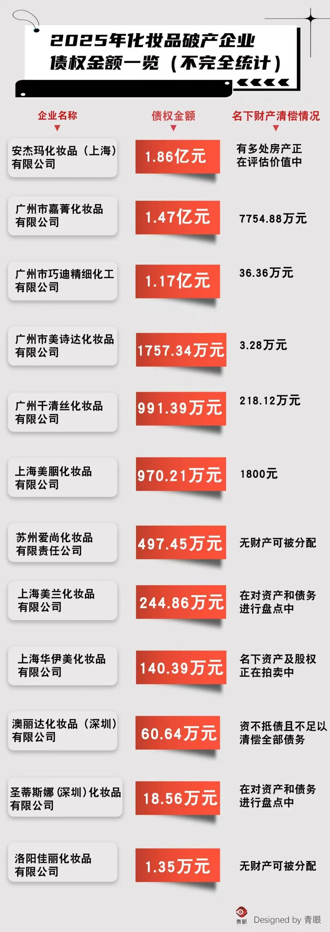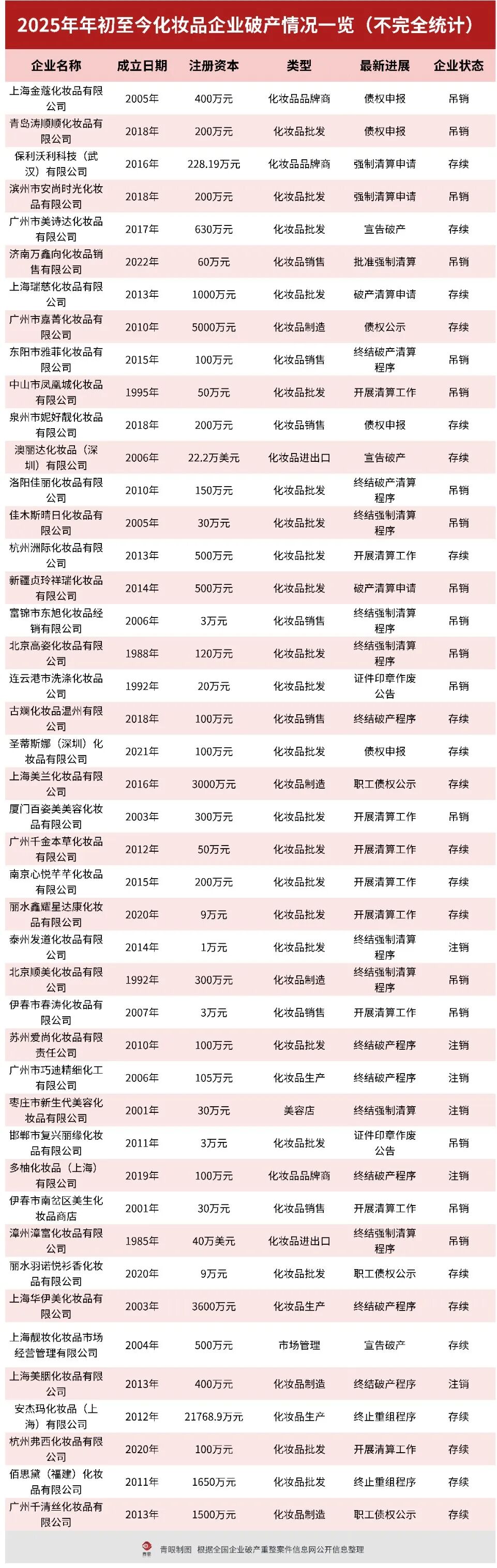 ▍截自国家企业信用信息公示系统然而,好景不长。2015年,国家食药监局发布不合格面膜名单中,该品牌的主力单品“金蔻4合1密集润白修复面膜”赫然在列,一个月内两次被检出含有禁用成分糖皮质激素,这一事件对其品牌口碑造成了毁灭性打击。产品质量出现重大问题后,主流电商平台对JKO金蔻品牌相关店铺商品进行了紧急下架处理,消费者和渠道商大规模退货,上海金蔻的经营状况自此陷入危机。青眼注意到,在经营危机爆发后,上海金蔻自2016年起多次被监管部门列入经营异常名录,并不断陷入债务纠纷。根据企查查相关信息,2018年,上海金蔻因未履行法律义务被列为失信被执行人,失信被执行标的总金额为350.7751万元,最终于2018年4月11日被吊销营业执照。2025年11月,由上海金蔻股东谢某某申请,法院裁决受理了上海金蔻强制清算一案,这标志着上海金蔻实质性地进入了破产清算阶段。而上海金蔻的破产,也仅仅是当下一部分化妆品企业经营现状的缩影。青眼以“化妆品”为关键词在企业破产重整案件信息网上检索统计发现,今年至少有44家化妆品企业因不能清偿到期债务或资产不足以清偿全部债务而被申请进行破产清算,破产/被清算企业主要经营范围为化妆品零售与批发、化妆品制造两类。从地域分布来看,这些破产/被清算企业主要来自东部沿海产业集中地区,排名前二的是广东8家和上海8家,均占比18.18%,显示出这些化妆品产业集聚区域的企业面临较大的经营压力。从注册资本看,大部分破产/被清算企业集中在1万-300万元之间,占比为70.45%,多为中小型企业。注册资本在1000万及以上的破产/被清算企业有7家,其中6家位于上海或广州。这其中,还有3家注册资本在3000万元及以上的企业,分别是上海美兰化妆品有限公司(注册资本3000万元)、广州市嘉菁化妆品有限公司(注册资本5000万元)和安杰玛化妆品(上海)有限公司(注册资本2.17亿元)。不过,2024年青眼统计的46家破产化妆品企业中,注册资本在1000万及以上的破产/被清算企业有16家。相比较而言,今年的市场形势可能对中小型企业更为不利,暴露出该类企业在抗风险能力上存在短板。从创立时间看,这44家破产/被清算企业中有12家企业的历史超过了20年,占比为27.27%,反映出部分老牌化妆品企业亦未能抵御近年来的市场冲击。据了解,破产清算/强制清算的顺序为成立清算组、清算组接管破产/被清算企业、破产财产分配、清算终结;其中,强制清算的基本流程为法院指定清算组接管公司,清算资产并偿还债务,强制清算结束后,企业会解散,且法人资格终止。