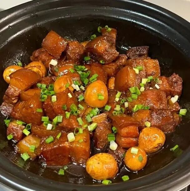 材料:一块五花肉,适量鹌鹑蛋,一把冰糖,葱姜料酒,料酒,生姜,八角,香叶,桂皮,生抽,老抽,葱花。