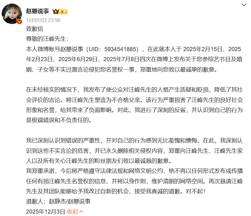 “在未经核实的情况下,我发布了使公众对汪峰先生的人格产生质疑和贬损,降低了其社会评价的言论。将汪峰先生塑造为不合格父亲。该行为严重损害了汪峰先生的良好社会形象和名誉,给其带来了负面影响。对此,我进行了深刻的反省,并认识到自己的行为是极端错误和不负责任的。