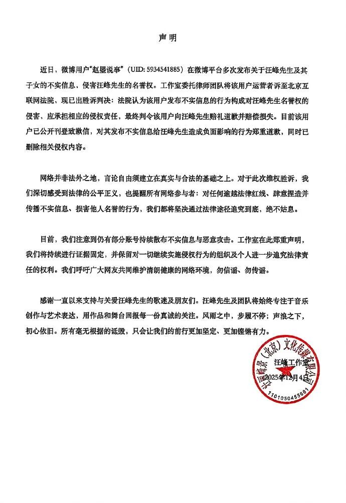 12月4日,汪峰工作室发声明回应涉及汪峰及家庭成员的不实信息,称发布者已道歉。近日、微博用户“赵墨说事”(UID:5934541885)在微博平台多次发布关于汪峰先生及其子女的不实信息,侵害汪峰先生的名誉权。工作室委托律师团队将该用户运营者诉至北京互联网法院,现已出胜诉判决:法院认为该用户发布不实信息的行为构成对汪峰先生名誉权的侵害,应承担相应的侵权责任,最终判令该用户向汪峰先生赔礼道歉并赔偿损失。目前该用户已公开刊登致歉信,对其发布不实信息给汪峰先生造成负面影响的行为郑重道歉,同时已删除相关侵权内容。