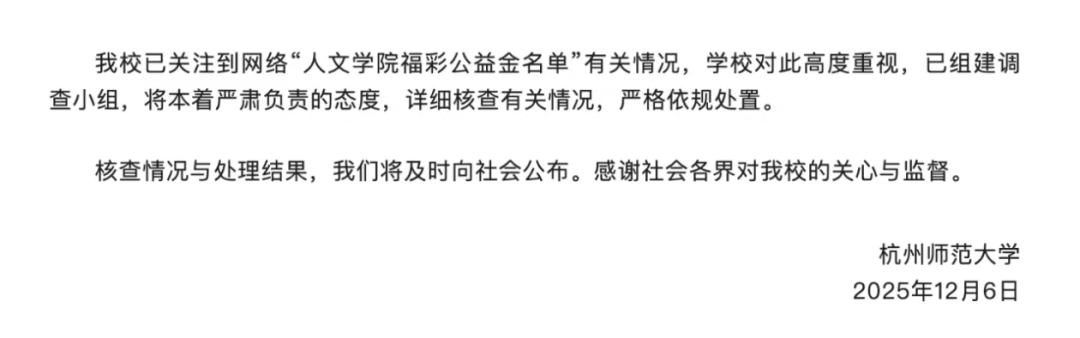 12月6日,杭州师范大学发布情况说明: 我校已关注到网络“人文学院福彩公益金名单”有关情况,学校对此高度重视,已组建调查小组,将本着严肃负责的态度,详细核查有关情况,严格依规处置。核查情况与处理结果,我们将及时向社会公布。感谢社会各界对我校的关心与监督。 潇湘晨报此前报道,12月5日,有网友注意到,杭州师范大学人文学院官方网站发布的福彩公益金项目受助对象公示中,名单里的部分人名出自百度文库《10000中国普通人名大全》文档。 △杭州师范大学人文学院官网公示的截图 △《10000中国普通人名大全》截图 据浙江省民政厅官网,其2023年6月30日公示了2022年浙江省省级用于社会福利事业彩票公益金使用情况,其中载明,杭州师范大学校友会 “多彩送教淳滋味”——浙江省淳安县助困助学项目,资助金额45万元。 12月6日,潇湘晨报记者致电浙江省民政厅综合办、社会组织管理局,截至发稿电话均未接通。 来源 | 潇湘晨报、如有侵权请联系删除