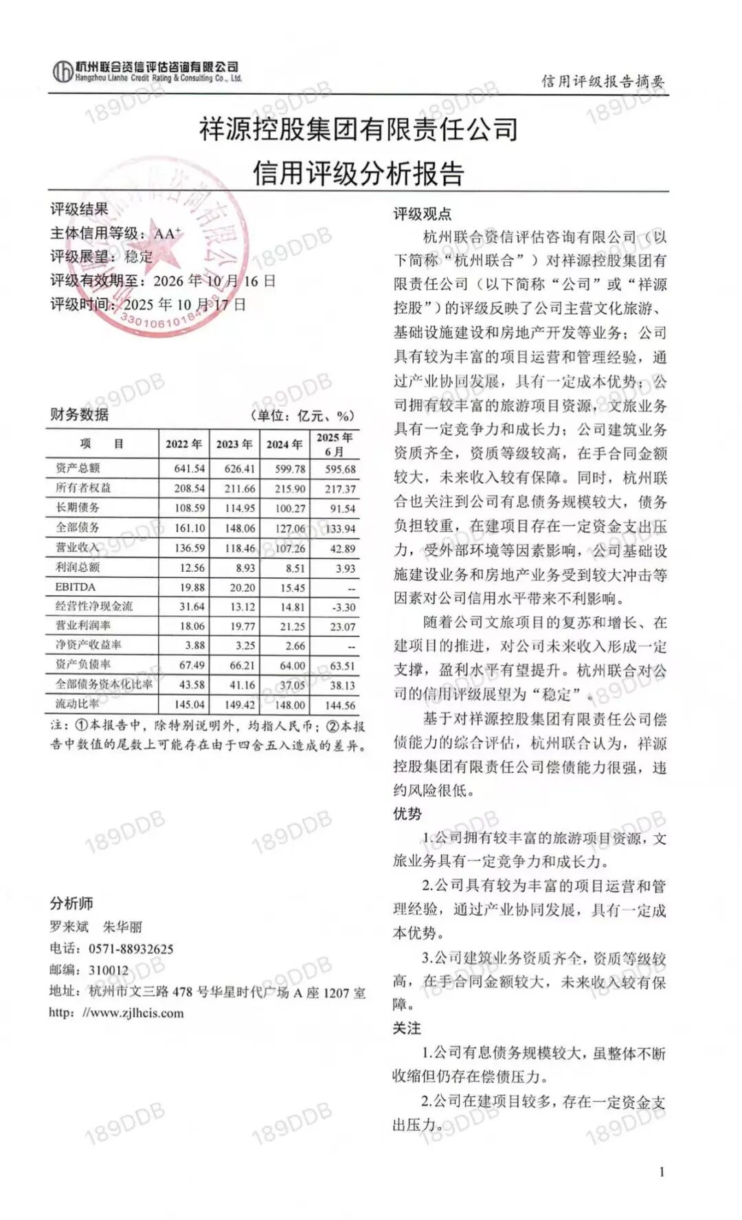 值得一提的是,杭州联合资信评估咨询有限公司2025年10月17日出具的评级报告显示,祥源集团信用评级为AA+,评级展望为稳定,评级有效期为一年。