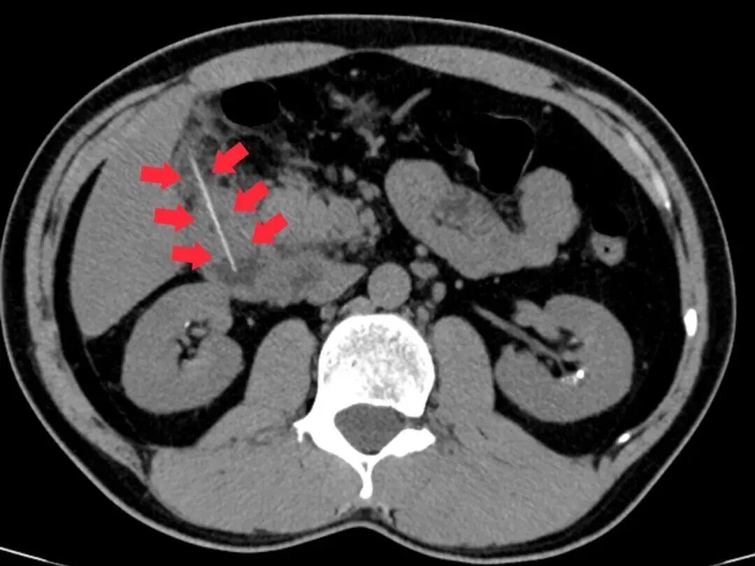 急诊科医生立即为其安排腹部CT检查,结果发现一根牙签滞留于十二指肠降部,且尖端已刺穿肠管壁,引发了局限性腹膜炎。情况危急,若任由发展,可能导致感染扩散、休克甚至危及生命。陈先生随即以“消化道异物并穿孔”被收治入院。