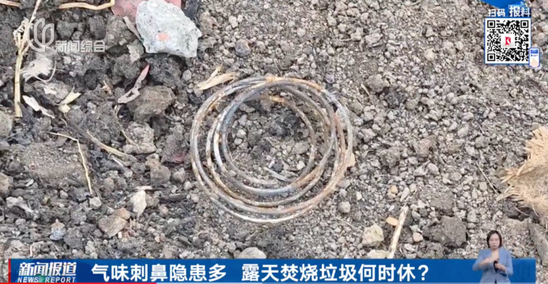 居民们提供的视频点位不同,视角各异。根据这些视频,记者在附近进行走访调查,发现了多处焚烧垃圾的痕迹,有类似焚烧床垫等生活垃圾留下的钢圈,也有焚烧大量电线、u盘、电路板等电子元器件的残留,还有的看似焚烧的是秸秆,但凑近一闻,有刺鼻的橡胶味。